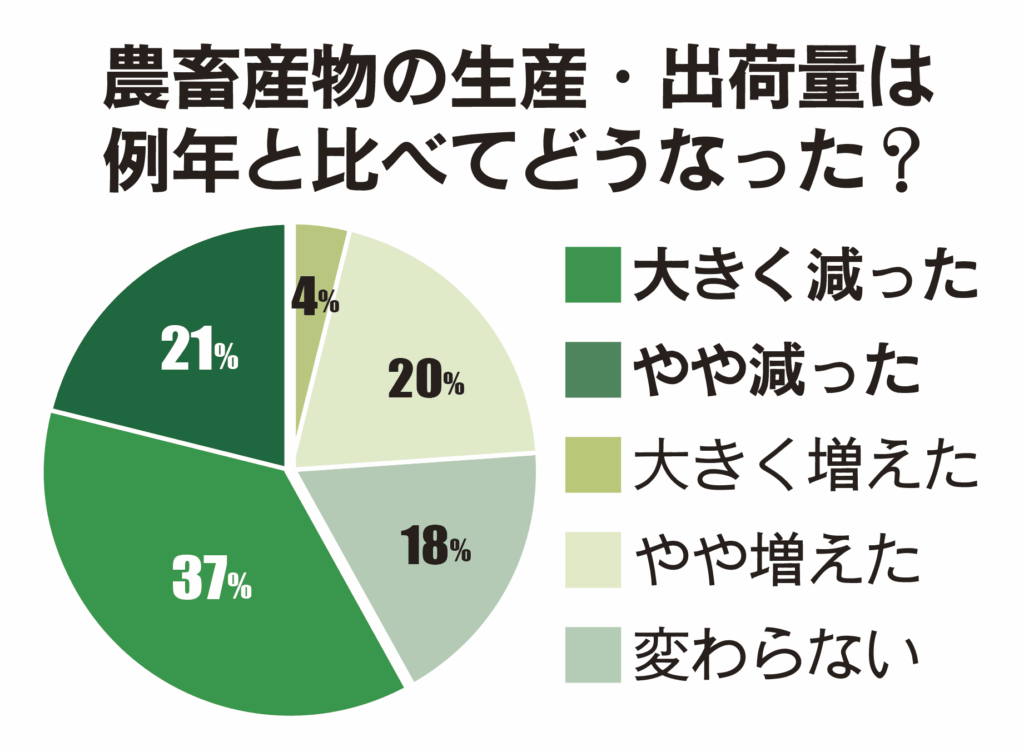 日本農業新聞「農家の特報班」が今年の高温・豪雨が農畜産物に与えた影響をアンケートしたところ、全回答者の6割に当たる69人が例年と比べて生産・出荷量が「減った」と答えた。酷暑の中、幅広い品目で生育が減退したという声が寄せられた。突発的な豪雨などの打撃もあり、生産現場が厳しい環境に置かれている実態が改めて浮かび上がった。