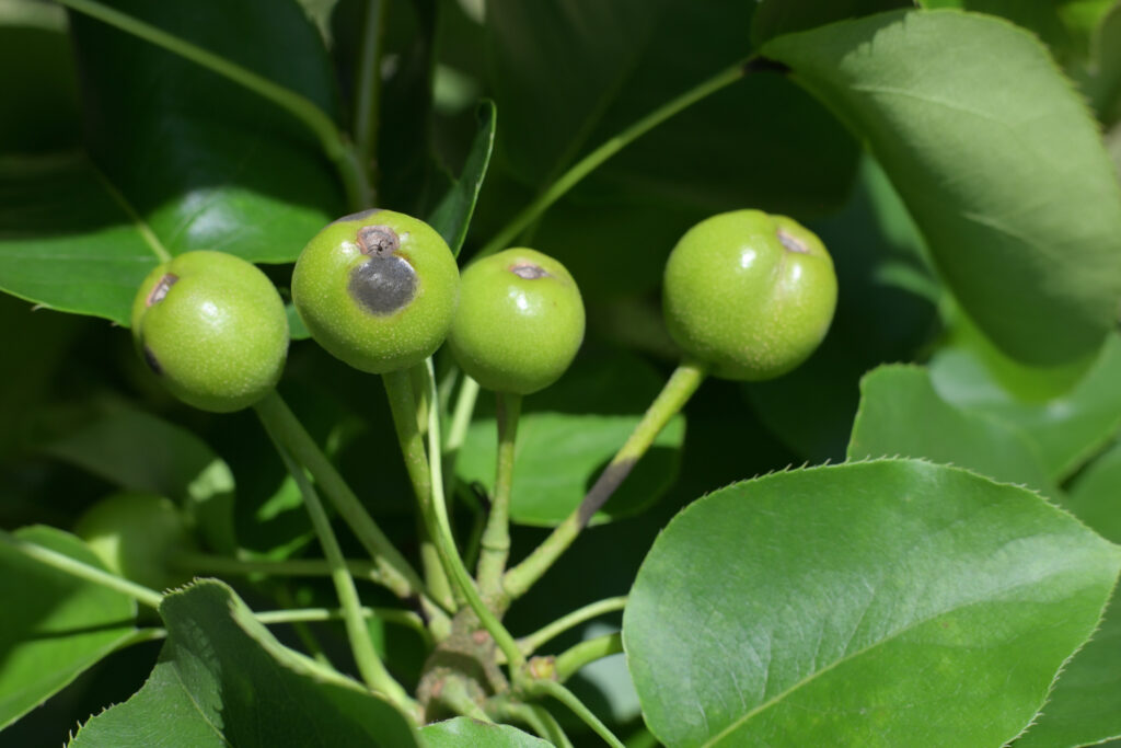 「幸水」「豊水」で被害が多い。越冬した被害落葉、芽基部の病斑から飛散した胞子が伝染源となる。3月下旬~5月に降雨とともに胞子が飛散し、幼果や新葉に感染、発病する。夏季はいったん発病が収まるが秋季になると再び感染、発病する。秋季に発病した葉に形成された胞子は芽のりん片に感染し越冬、翌春に芽基部病斑を形成し伝染源となる。黒星病に対しては、生育初期の防除が重要でありDMI剤、チウラム剤などを散布する。