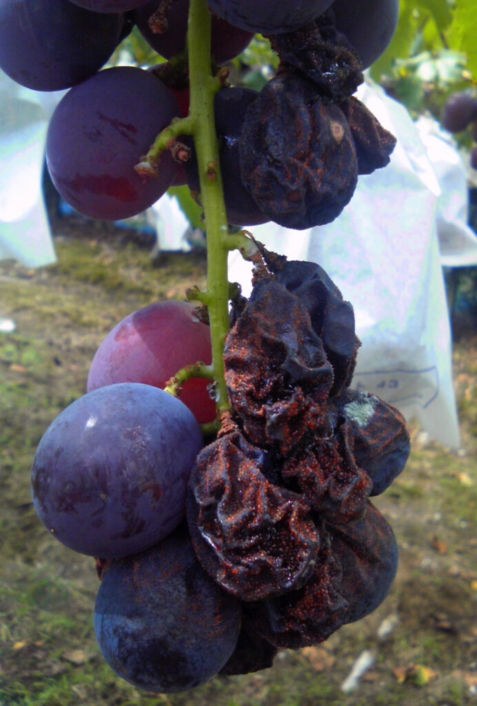 収穫期の果房を腐敗させるため経済的な被害が大きい。病原菌は幼果の時期に感染するがすぐには発病せず、収穫が近づき果実の糖度が上昇すると急速に腐敗を引き起こす。