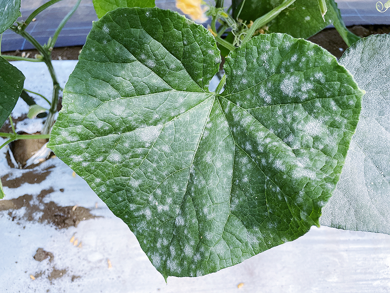 | 葉・茎を見る | 葉に葉脈で囲まれた角型の黄化から淡褐色病斑となる。病斑の葉裏に灰黒色のカビを生じる |