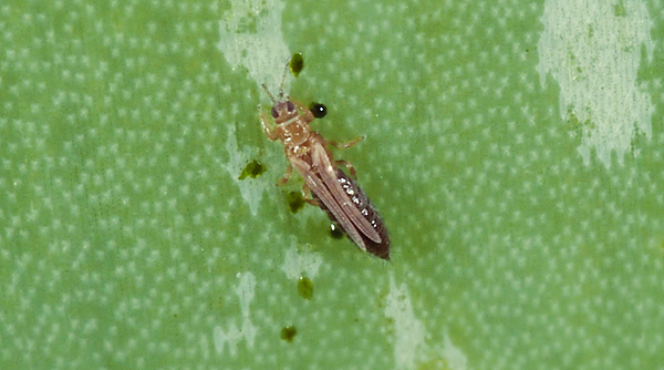| 葉・茎を見る | ・メス成虫が葉身の外側に黄褐色の毛で覆われた卵塊(数百個の卵)を層状に産み付ける ・孵化(ふか)幼虫は集団で葉身を外側から食害し、内側に入った幼虫は内側から表皮を残して葉肉を食害するため、葉身が白化する ・食害によって収量の低下や品質低下を引き起こす。被害が激しい場合には、株全体が枯死する |