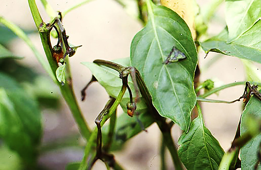 ・茎に暗褐色の病斑を生じ、茎を一周するように広がり、感染部が折れて腐敗する