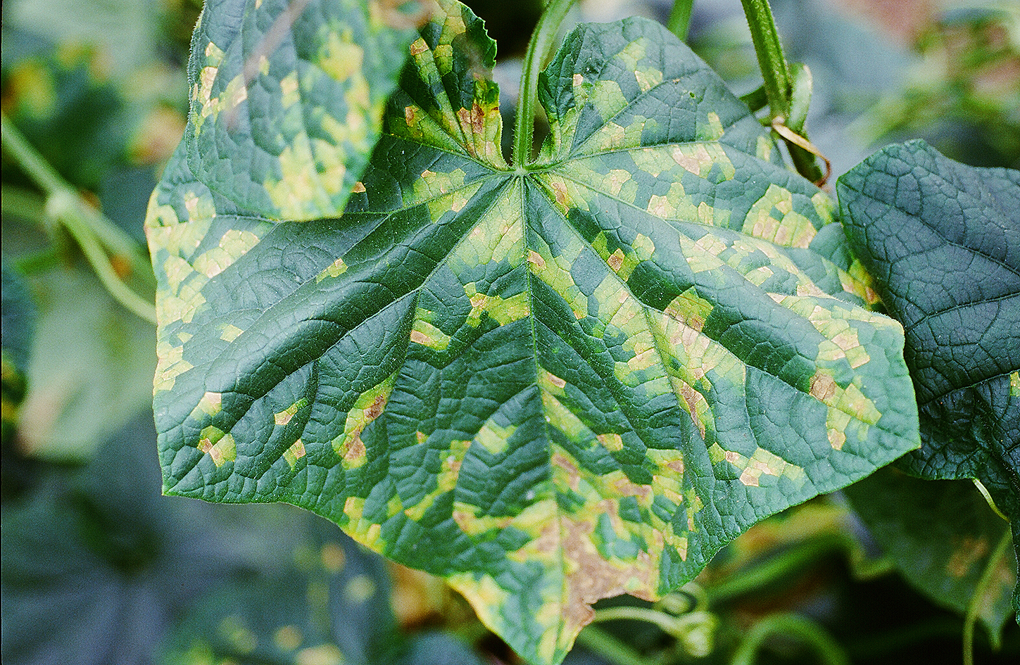 | 葉・茎を見る | 新梢(しんしょう)で褐色の小斑点を形成し、発病が激しいと縮れたような奇形となり、生育が停止する |